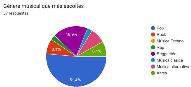 La primera pregunta és quin és el gènere musical que cada un escolta més. La música pop va ser la més votada amb el 51,4%, més de la meitat de la resta d’opcions. En segon lloc, va ser el reggaeton amb el 18,9%. Li segueixen el rock amb el 8,1%, la música alternativa i altres generes i per últim, la música clàssica i rap amb el 2,7%.