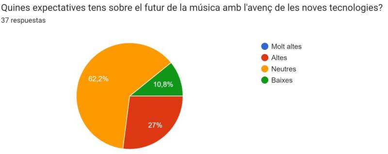 Finalment, la pregunta és sobre quines expectatives tenen sobre el futur de la música amb l’avenç de les noves tecnologies. El 62,2% tenen expectatives neutres, el 27% expectatives altes i el 10,8% baixes.