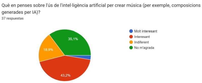 La setena pregunta és sobre que en pensen sobre l’ús de la intel·ligència artificial per crear música. El 43,2% va respondre que és interessant, el 35,1% no li agrada, al 18,9% li és indiferent i el 2,7% molt interessant.